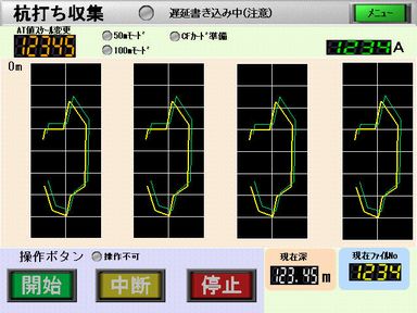外部に深度センサ(エンコーダ)、電流センサ(CT)を設けこれらのセンサより収集した測定値を演算しCFカードへ収集していきます。 基礎杭を打ち込む際にデータを収集します。